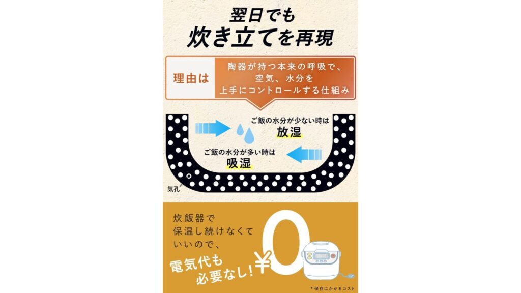 陶器ならではの調湿効果で、冷ご飯でもふっくらモチモチの食感を再現できると注目されています。