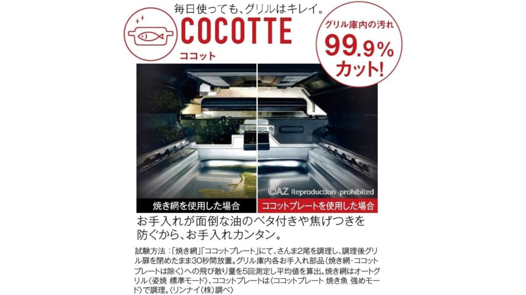 - 庫内の汚れ防止機能はない:油ハネや煙がグリル内に広がる