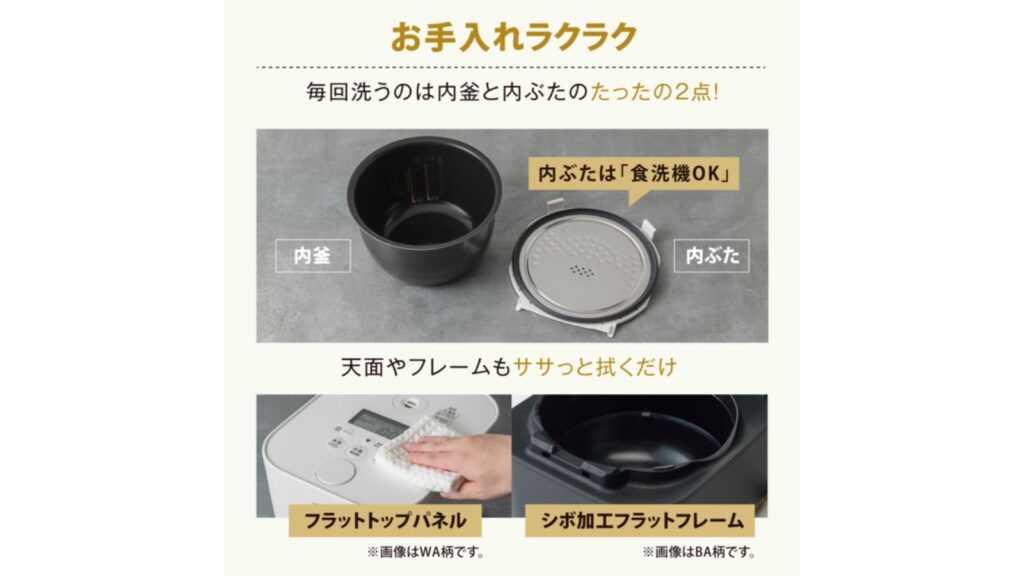 - 蒸気口の掃除がやや面倒:取り外しができない構造なので、布巾でこまめに拭く必要があります。